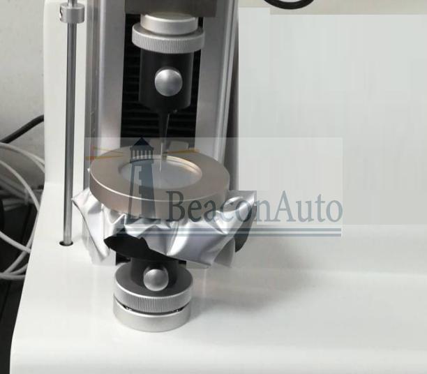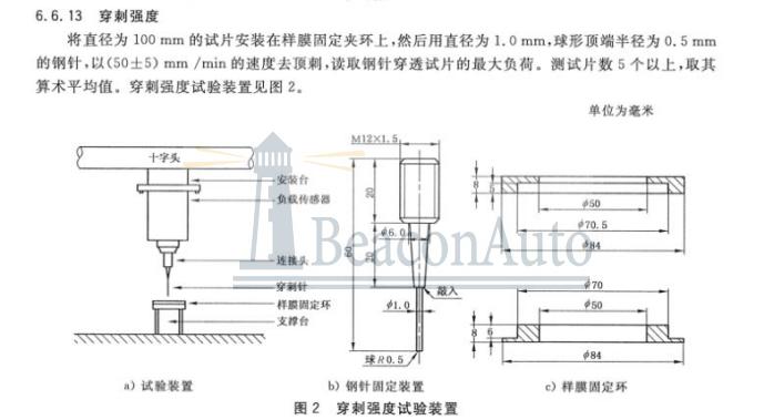 將直徑為100mm的試片安裝在樣膜固定夾環(huán)上,然后用直徑為1.0mm,球形頂端半徑為0.5mm的鋼針,以(50±5)mm/min的速度去頂刺,讀取鋼針穿透試片的大負荷,測試片數(shù)5個以上,取其平均值。